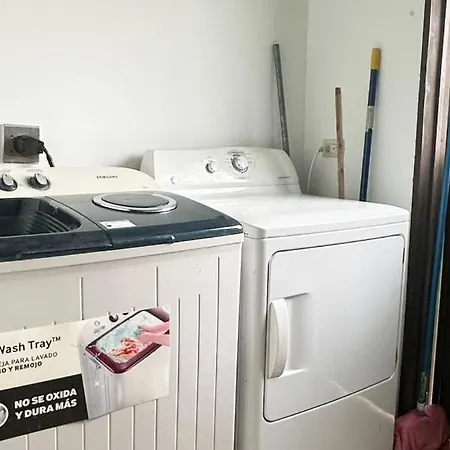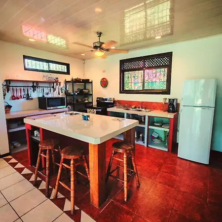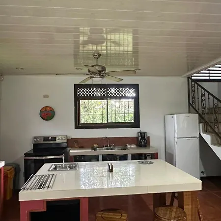 Valle Del Arenal House Family Home In La Fortuna offers an equipped kitchenette featuring a fridge, an oven, and glassware. - ❓